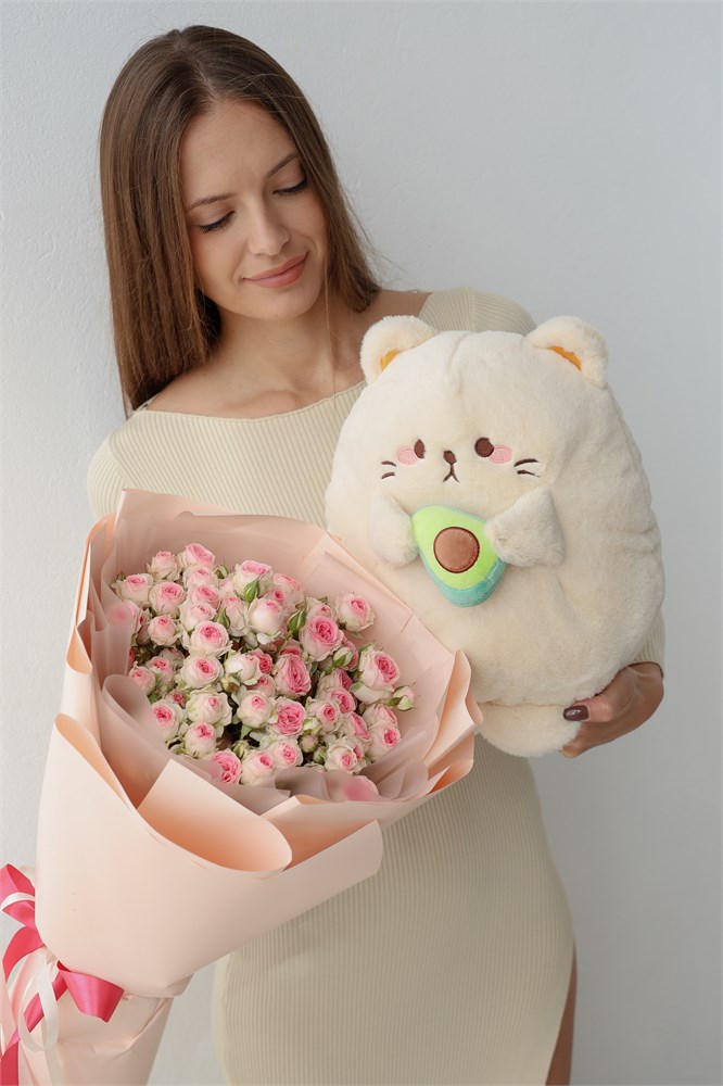 Набор Кустовые розы Кейт (15шт) + Котик с авокадо бежевый и открытка