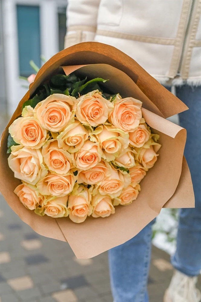 Букет 'Персиковая роза 21шт' — это воплощение утончённости и свежести. Его изысканные цветы создадут прекрасную атмосферу и наполнят день яркими эмоциями.